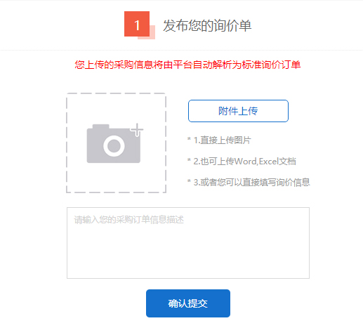 3.上傳您的“詢價單”文件(可以是圖片、Word、Excel格式文件),確認提交后系統自動解析發布您的詢價單